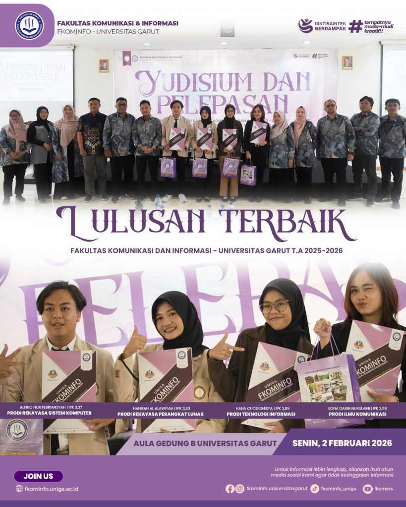 Fakultas Komunikasi & Informasi Universitas Garut (FKOMINFO UNIGA) telah melaksanakan kegiatan Yudisium dan Pelepasan Mahasiswa Tahun Ajaran 2025–2026 pada [Senin, 2 Februari 2026] di [Aula Gedung B – Universitas Garut].